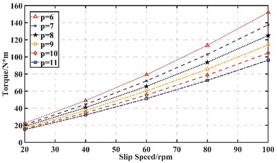 The establishment of the initial magnetic field and the generation of eddy currents in the APMC all originate from the PMs. The number of pole pairs of the PMs determines the distribution and periodicity of the magnetic field in the air gap and the eddy currents in the conductor plate, which plays a decisive role in the output performance: it is then one of the most important design parameters of the device. The output torque characteristic curves for the number of pole pairs vary from 6 to 11 and are given in Figure 13. It can be seen that the output torque increases with an increase in the number of pole pairs, but the growth rate decreases. In other words, there must be a critical pole pair value so that the torque no longer increases with the number of pole pairs. In addition, PMs cannot be used in large quantities due to their expensive prices in practical engineering applications. Therefore, it is particularly important to balance the relationship between the number of PMs and output performance in the optimization of APMCs.