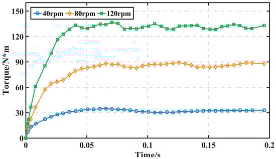 The dynamic torque characteristics of the APMC at an air gap thickness of 2 mm and different slip speeds are shown in Figure 14. The startup process of the APMC is essentially the establishment and action process of the magnetic field. At the initial stage, there are no eddy currents inside the copper rotor. The increasing slip speed causes the eddy currents to gradually increase, and the output torque also increases accordingly. However, the torque will not reach its maximum immediately due to the magnetic resistance of the copper rotor. Ultimately, the output torque will achieve dynamic stability.
