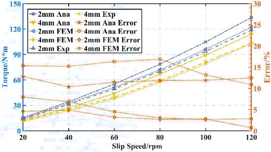 The measured torque characteristic curves of the prototype at the air gap thicknesses of 2 mm and 4 mm and their error curves with analytical and finite element methods are given in Figure 16. According to the experimental results, it can be concluded that: (1) The increase in the air gap thickness significantly reduces the output torque at the same slip speed. (2) The error rate of the two methods is within 18%; although they are relatively accurate, there is still great room for improvement. (3) The 3D FEM is more consistent with the actual test results with an error rate of 5–8%. Therefore, in the absence of a measured prototype, the results of the 3D FEM can serve as a verification benchmark, which provides convenience for the optimization of the device. (4) The possible sources of the errors are mainly the influence of the conductor plate temperature rise on the characteristics of the APMC and the deviation generated by the sensor data.