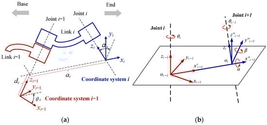 Schematic diagram of the coordinate system transformation of the MDH model. (a) Modeling of non-parallel joints. (b) Modeling of parallel joints.