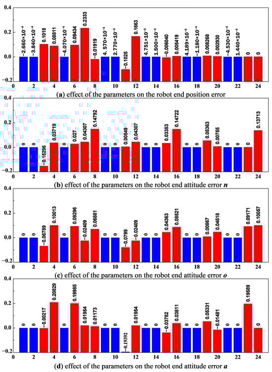 However, SPi, Sni, Soi, and Sai are all three-dimensional vectors, and it is impossible to quantitatively analyze the effect of the parameters. In order to quantify the effect of the kinematics parameter error on the end pose error, the definition of Equation (9) is introduced to express the projection length of the error vector caused by the kinematics parameter i on the robot’s end error vector. represent the significance index of each kinematics parameter on the position vector, attitude vector on the x-axis, attitude vector on the y-axis, and attitude vector on the z-axis, respectively.