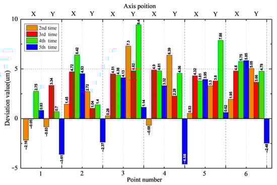 In the actual measurement process for the robot’s end pose, the default position of the 1D manual moving platform is defined as P1 and the point after moving by 10 mm is defined as P2. The point P1 is recorded as the origin point of the coordinate system of the partial pose measuring device. The direction vector formed by the point P2 and the point P1 is recorded as the direction vector on the y-axis of the flange coordinate system. According to the performance parameters of the 1D moving platform, the control accuracy is 0.01 mm and the parallelism misalignment is 0.02 mm, which can sufficiently meet the measurement accuracy requirements of the robot’s end. To verify the measurement accuracy of the device, the robot was moved to any position and then the 1D moving platform was manually moved from the point P1 to the point P2, moving 1 mm each time, and the spatial location of the 1.5-inch target ball was recorded by the laser tracker five times. The above steps were repeated 5 times to calculate the repeatability of the operation and the accuracy of the device. The experimental results are shown in Figure 5. The first-time record is set as a reference. And comparing with the other four times, the deviation value can be obtained. There is a fixed position deviation on the x-axis of the device for every 1 mm movement on the y-axis direction. When the device moves by a length of 1 mm, there will be a position error on the x-axis. The error can be treated as a system error to compensate. In addition, the repeatability of the partial pose measurement device is better than 0.005 mm.