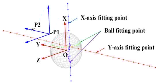 Firstly, control the robot to move in the positive direction of the x-axis and the y-axis along the default flange tool coordinate system to obtain the direction vector of the tool coordinate system. Then, control the robot to rotate in the positive direction of the x-axis and the y-axis of the default tool coordinate system. And using the least square multiplying method to fit the ball, the center of the ball is the origin of the flange tool coordinate system. Measure the spatial position of the 1.5-inch target ball at the point P1 using the laser tracker and record the point as P01.