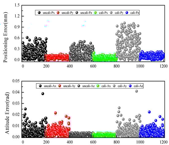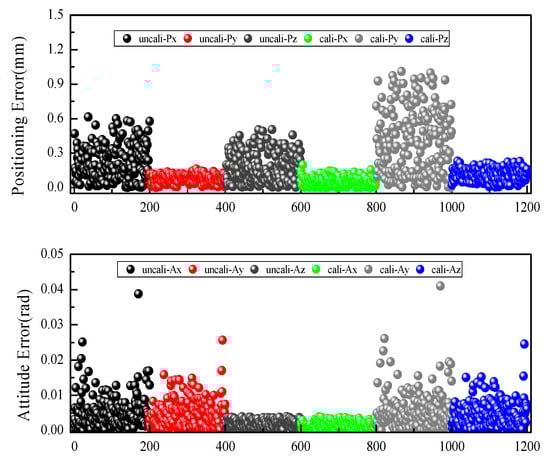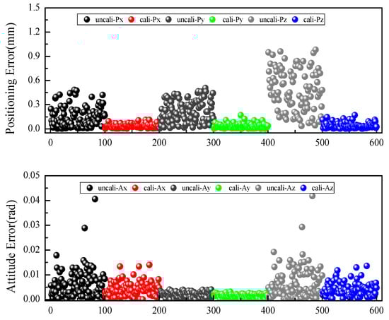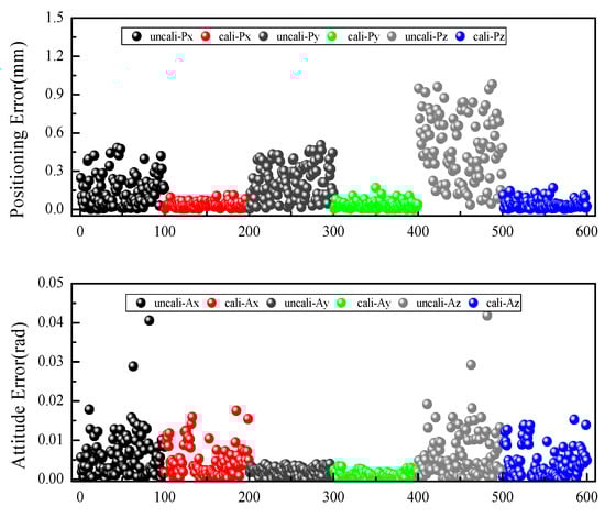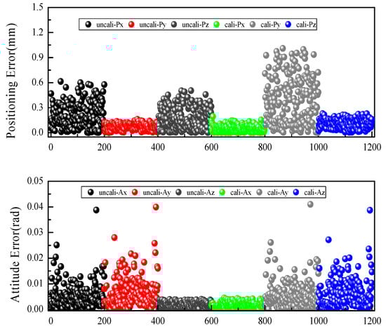 Comparison of the axial position error and the axial attitude error before and after calibration based on the identification data set of the full pose error model.