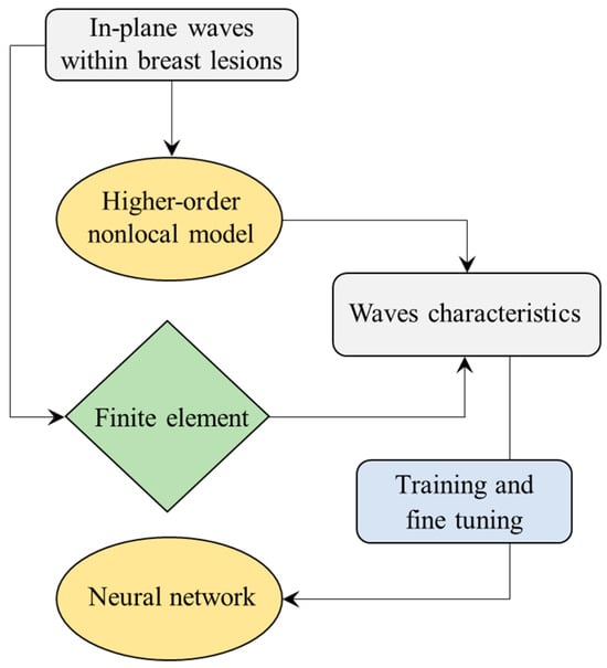A flowchart to depict the present research workflow: (1) in-plane waves are propagated within various types of healthy, benign, and malignant breast conditions; (2) a higher-order nonlocal model is developed to extract the in-plane wave characteristics; (3) the mathematical model is integrated with a neural network algorithm to improve the accuracy and flexibility of the model for clinical applications; (4) a finite element comparison study is conducted to verify the validity of the model.