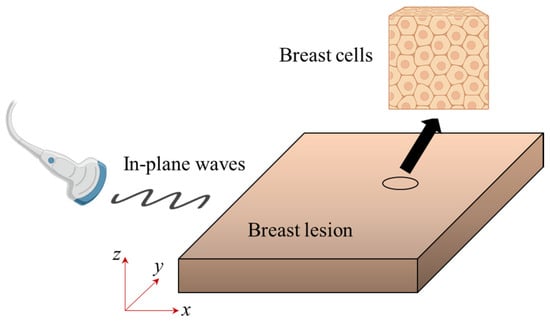 A schematic representation of human breast sections under in-plane elastic wave propagation. An ultrasound transducer can be used to create in-plane waves. The direction of vibrations caused by the transducer is placed within the x-y plane. There is no significant lateral displacement (i.e., perpendicular to the plane of the breast sections).
