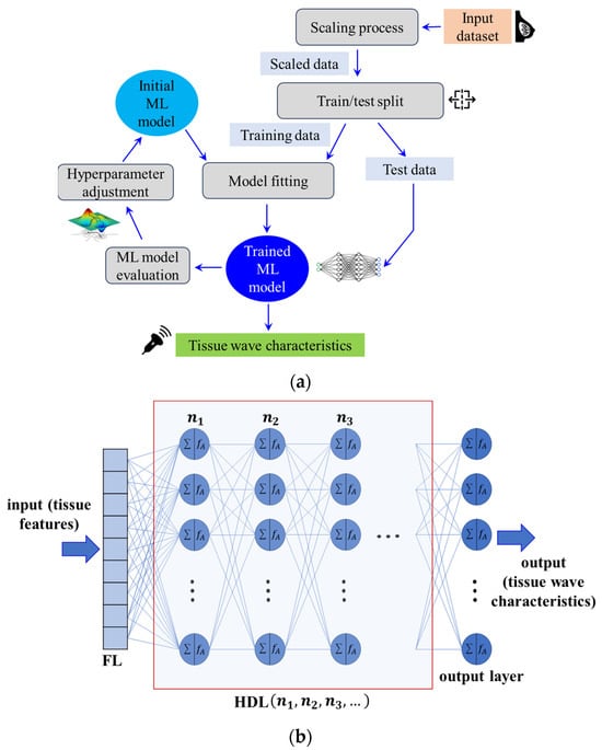 TensorFlow, NumPy, and pandas were used to develop the deep neural network model, to work with multi-dimensional matrixes, and to create the database, respectively [66,67]. Keras, as a high-level application programming interface for conveniently working with TensorFlow 2.14.0 machine learning software, was adopted [68]. Moreover, to divide the dataset into 70% training and 30% testing subsets, the train_test_split method of the model_selection module of the sklearn python library was used. The dataset used for training and testing contained 100 human samples diagnosed with DCIS. To build the deep learning model, several architectures were considered using the sequential method of Keras. Overall, the neural network was composed of one flatten layer, a couple of hidden dense layers, and an output layer as shown in Figure 3a. In clinical applications, it is often challenging to find patients of all different pathological conditions, leading to relatively small datasets. Thus, a simple neural network can be adopted to prevent overfitting and ensure the generalisation capability of the model despite the restricted human breast samples. In addition, simpler neural network algorithms are computationally inexpensive and faster to implement as they require less training time as well as a faster hyperparameter adjustment process. A sequential deep neural network model of feedforward type was utilised in this study for prediction, which was made of several hidden layers. A rectified linear unit (ReLU) was employed as the activation function of dense layers, which allows for the incorporation of nonlinearity and complexity in real-world problems. An Adam optimiser with a learning rate of 0.001 and mean-square-error loss function was used to compile the machine learning model. Data scaling was performed prior to the training process to ensure consistency with the scale of all features. The training process was conducted for 500 epochs. During each epoch, the entire training dataset was passed forward and backwards within the artificial neural network. The rationale for choosing a relatively high epoch number is the limited sample size, which is usually the case in clinical studies where providing human tissue samples is not straightforward. This ensures that the neural network model has been sufficiently exposed to the available data for training and generalisation purposes. Figure 3b shows a flowchart to visualise the different steps and processes involved in the machine learning modelling of the in-plane wave propagation analysis of human breast lesions. The model evaluation, which is essential for hyperparameter adjustment, was conducted using the mean square error of both training and test datasets. The learning rate, number of neurons within a dense layer, number of dense layers, activation function, number of epochs, and the optimiser technique have been adjusted during the hyperparameter adjustment process to obtain a highly accurate neural network model.