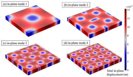 To verify the analytical higher-order nonlocal strain gradient modelling, a finite element study was conducted on three different types of breast tissue, including healthy fibroglandular tissue (FGT), ductal carcinoma in situ (DCIS), and fat necrosis, which is a benign condition. The results (dimensionless phase velocities) are listed in Table 1 for the first three mode numbers (n = 1, 2, 3). The elasticity moduli of different human breast tissue were adopted from those reported by Samani et al. [28]. They conducted experimental mechanical testing on 169 human samples to extract the elasticity properties of pathological breast tissues. The scale parameters were set to zero as these parameters are not incorporated in commercial finite element software packages like Comsol Multiphysics version 5.5. The thickness of the tissue samples was set to 1 cm while the tissue side length was 10 cm in this study. The Poisson’s ratio of all breast lesions was taken as 0.495 [28] while the physical mass density of breast tissue was set to 945 kg/m3 [69,70]. The patterns of in-plane wave propagation within the breast tissue, obtained using the finite element simulations, are also depicted in Figure 4 for the first four in-plane modes. The visualisation was performed on the DCIS. Similar patterns were found for other breast lesion types, which are not included here for the sake of brevity.