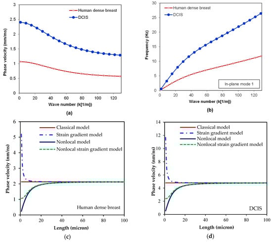 (a) Phase velocity of in-plane waves propagated within the human dense breast and DCIS versus the wave number; (b) frequency of in-plane vibrations induced by the wave propagation within the human dense breast and DCIS. The first mode of in-plane vibrations was excited to extract the wave propagation characteristics of the breast lesion. A scale-dependent model of higher-order nonlocal elasticity was used for calculations. Phase velocity of in-plane elastic waves within (c) a human dense breast and (d) DCIS versus sample size for different models including nonlocal, strain gradient, classical and a combination of them.