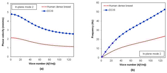 (a) Phase velocity of in-plane waves propagated within the human dense breast and DCIS versus the wave number; (b) frequency of in-plane vibrations induced by the wave propagation within the human dense breast and DCIS. The fibroglandular tissue was assumed as the main building block of the dense breast while early breast cancer was mainly found in the form of the DCIS. To estimate the wave propagation characteristics of breast lesions, the second mode of in-plane vibrations was excited.