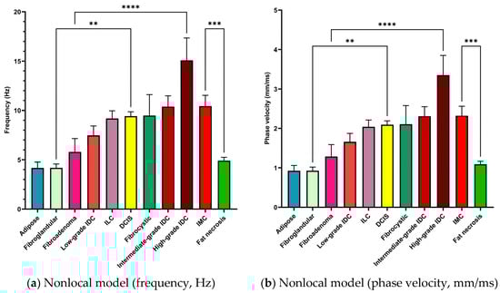 (a) Frequency and (b) phase velocity of in-plane waves propagated within various breast lesions estimated based on the nonlocal elasticity model, in which the zeroth-order nonlocal parameter was 2 cm while the remaining scale parameters were ignored. Here ‘**’ means p ≤ 0.01, ‘***’ represents p ≤ 0.001, and ‘****’ indicates p ≤ 0.0001.