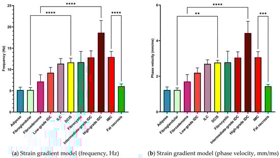(a) Frequency and (b) phase velocity of in-plane waves propagated within various breast lesions estimated based on the strain gradient elasticity model, in which both zeroth- and first-order nonlocal parameters were zero while the remaining scale parameter was 2 cm. Here ‘**’ means p ≤ 0.01, ‘***’ represents p ≤ 0.001, and ‘****’ indicates p ≤ 0.0001.