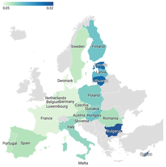It should be emphasized that such indicators as return on investment, local economy, and market capacity characterize the economic sustainability of the national economy most fully. However, the possibilities of their use in the study are limited by the following factors. The return on investment is determined by sectoral affiliation and can vary significantly within the economy of one country. In the conditions of globalization and internationalization of business, integration of individual countries’ economies into the world supply chains, it is quite difficult to assess the capacity of local markets in relation to the national economy. The existing statistical observation in Eurostat does not allow providing reliable data on all countries and ensuring the convergence of results. It is also logical that the assessment of the vulnerability of the local economy determined by the level of its diversification has a great predictive potential. However, in the proposed study the local economy was assessed using universal macroeconomic indicators.