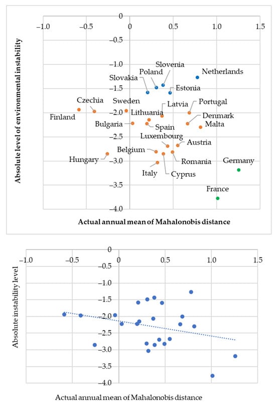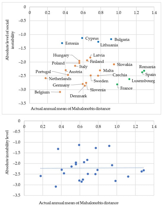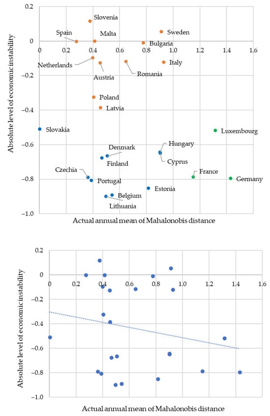 The countries of the third group (Germany, France, and Luxembourg, green dots) are characterized by a low level of economic instability with high values of Mahalonobis distance. This is the stability of the strong, indicating their higher degree of structural and institutional development.