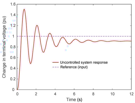The parameters for the SCA-based PID controller [] are as follows: , , and . The transfer function of the closed-loop AVR system using this approach is given by the following equation.