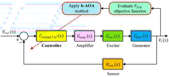 In the existing landscape of AVR control, controllers have emerged as indispensable assets for the vigilant monitoring and regulation of the AVR itself []. These controllers serve as hubs, facilitating real-time adjustments to maintain voltage stability, enabling remote monitoring, fault detection, and automatic shutdown during emergencies, and enhancing the overall system dependability. A range of controllers, from the standard proportional–integral–derivative (PID) to more advanced variants like the PID Acceleration (PIDA), fractional-order PID (FOPID), and PID with a second-order derivative (PIDD2), offer diverse attributes to meet the specific requirements of AVR control [,,,,,,,].