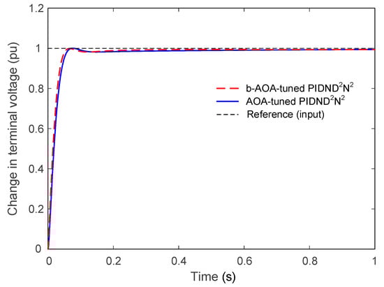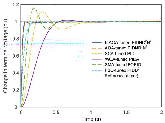 In this section, we compare the proposed PIDND2N2 controller tuned with the b-AOA to several recently reported control methods for the AVR system. These methods include a variety of controllers, each tuned using different optimization algorithms such as marine predators algorithm (MPA)-based FOPID [], hybrid atom search particle swarm optimization (h-ASPSO)-based PID [], equilibrium optimizer (EO)-based TIλDND2N2-based controller [], reptile search algorithm (RSA)-based FOPIDD2 [], improved Runge–Kutta (iRUN) algorithm-based PIDND2N2 [], symbiotic organism search (SOS) algorithm-based PID-F [], whale optimization algorithm (WOA)-based 2DOF FOPI [], Lévy flight-based RSA with local search ability (L-RSANM)-based PID [], chaotic black widow algorithm (ChBWO)-based FOPID [], genetic algorithm (GA)-based fuzzy PID [], sine cosine algorithm (SCA)-based FOPID with fractional-order filter [], hybrid simulated annealing–Manta ray foraging optimization (SA-MRFO) algorithm-based PIDD2 [], slime mould algorithm (SMA)-based PID [], gradient-based optimization (GBO)-based FOPID [], and nonlinear SCA-based sigmoid PID [].