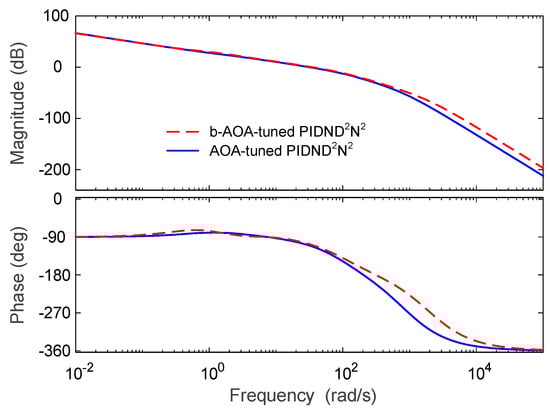 Open-loop Bode diagrams for b-AOA- and AOA-tuned PIDND2N2 controllers.