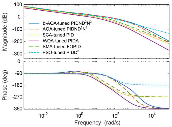 To validate the superiority of the proposed b-AOA approach, we conducted extensive comparative analyses, evaluating its performance against well-established control methodologies, such as the sine cosine algorithm-based PID controller [], whale optimization algorithm-based PIDA controller [], slime mould algorithm-based FOPID controller [], and particle swarm optimization-based PIDD2 controller []. The results unequivocally demonstrate that the b-AOA-based approach outshines its counterparts. It exhibits unmatched transient response characteristics, with the shortest rise time (0.033485 s) and settling time (0.050752 s) while eliminating overshoot. In contrast, other methods exhibit less favorable response characteristics. In terms of frequency response, the b-AOA approach consistently excels, showcasing robust stability, favorable gain margins, and a broader bandwidth.