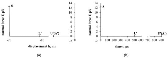 The results are given in Figure 2 and Table 2 (first part). Here, platelet behavior is represented by evaluating adhesion and elastic forces, while electrostatic double layer forces and fluid drag forces are not taken into account. This study is close to the case when a cell interacts in an air environment. In research, it has been observed that interactions involve both approach and contact. The duration of the interaction is about 18 μs (Table 2, first part, point A′). When approaching, the maximum adhesive force is 10 pN (Table 2, part one, point L). According to well-known studies with platelets (Rana et al. [35]; Kim et al. [36]), there is a high-affinity state engaging ~10 pN with around 20-fold longer bond lifetime and greater ability to withstand strong hemodynamic forces. Deformation occurred only when the platelet came into contact with the surface of the blood vessel. The maximum achieved total repulsion force is about 23 pN, and the displacement is about 31 nm (Table 2, first part, point U). During the deformation process, when the platelet is unloaded, the platelet does not have enough kinetic energy to separate from the surface. At point A′, the attractive force achieved is about ≈17.2 pN, the magnitude of which is in the range from 4.7 to 19.3 pN, which is observed in known physical experiments with platelet tension (Zhang et al. [37]).