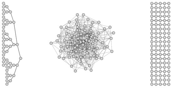 - ER: classical Erdös–Rényi (ER) random graph [31]. In the ER model, each edge has a fixed probability of being present or absent, independent of the other edges. The ER graph is defined by two parameters only: the number of nodes, ; and the probability of drawn links, . We indicate the of the (number of nodes) and (probability of links) between each pair of vertices. We investigate ER network with and .