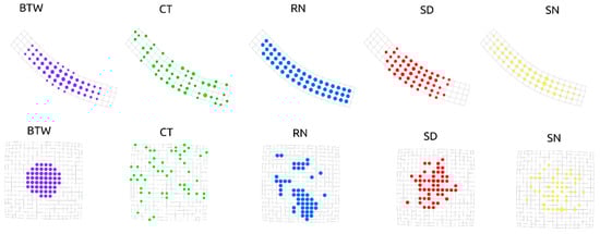 - LTC: rectangular (or square) lattice (LTC) complex network. A lattice graph is called a mesh or grid graph in graph theory. The LTC is a specific lattice graph where nodes form a grid with square meshes. The LTC can be defined by two parameters, and , indicating the number of nodes along each side. We simulate two networks by choosing and [32].