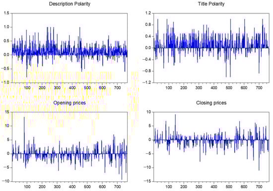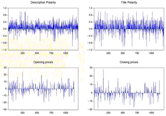 In Figure 3, the line graphs for all of the analyzed variables for the Tesla stocks are presented as follows: description polarity, title polarity, opening prices (first differenced), and closing prices (first differenced). It can be observed that the title polarity scores present a higher variance compared to the description polarity scores.