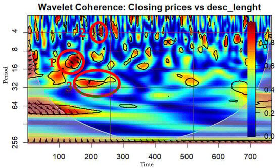 where f is the frequency, t is time, W ¯ denotes the complex conjugate of W, and |⋅|denotes the absolute value. The numerator expression | W 1 ( f , t ) W 2 f , t | ¯ represents the cross-wavelet power, and the denominator represents the normalization factor. The normalization ensures that the coherence values are between 0 and 1, where 0 indicates no coherence, and 1 indicates perfect coherence. Afterwords, the wavelet coherence was plotted. The coherence patterns may indicate high or low coherence regions. Regions with high coherence indicate that the two time series are strongly correlated at specific time–frequency points. This suggests that the two signals have similar patterns or periodicities at those scales. Regions with low coherence indicate a lack of consistent correlation between the two signals at specific time–frequency points. It is essential to assess the statistical significance of coherence values. Many wavelet coherence implementations provide significance levels, usually through a significance test or confidence intervals. High coherence values that exceed the significance level are more likely to represent meaningful associations.