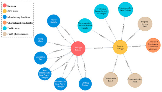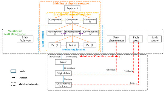 Figure 9 shows some of the mainline of condition monitoring. Red nodes belong to the sensor entity, yellow nodes belong to the raw data entity, dark blue nodes belong to the monitoring location entity, orange nodes indicate the characteristic indicator entity, light blue nodes belong to the fault cause entity, and gray nodes belong to the fault phenomenon entity.