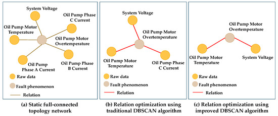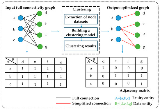 Based on the information entropy and density-based DBSCAN clustering algorithm, the monitoring data in the mainline of condition monitoring and the fault entities in the mainline of fault maintenance are extracted, and the local model is established. Taking the entropy value of the real fault data as the benchmark, the entropy and clustering results of the associated entity data are judged, and finally, the association strength between the data and the fault phenomenon is determined to optimize the local network. For example, to establish the connection between data entities and fault phenomena, local small clustering models are established using data entities. The information entropy of the entity data and the dispersion of each data point in the clustering results on the projection plane (information entropy) are compared with the dispersion of the data associated with the real fault phenomenon on the projection plane to determine the strength of the connection between the requested data and the fault phenomenon. The clustering analysis process based on static graphs is shown in Figure 4. The black lines indicate the original static fully connected network, the red lines indicate the simplified network connection, and the adjacency matrix indicates whether a relationship exists between two entities, with 1 indicating a relationship and 0 indicating no relationship.