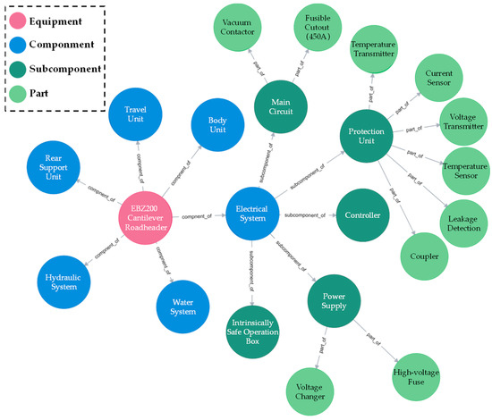 The mainline of the physical structure is the core backbone of the entire knowledge graph, which is constructed from the real hardware topology of the roadheader, and the entity types are named as the entire machine, components, subcomponents, part entity types, and relationships between entities according to the mechanical, hydraulic, electrical and water system aspects.