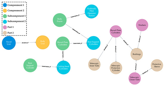 Figure 7 shows the mainline of the physical structure. Here, the red nodes belong to the whole machine entities, the blue nodes belong to the component entities, the dark green nodes belong to the subcomponent entities, and the light green nodes belong to the part entities.