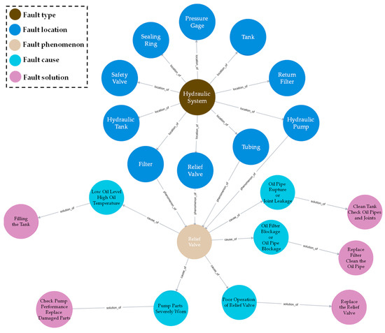 Based on empirical knowledge, the mainline of fault maintenance is divided into four parts: mechanical systems, hydraulic systems, electrical systems, and water systems. The entities are named, and the type of relationship is determined. The fault maintenance mainline of the entity names fault type, fault location, fault phenomenon, fault causes, and solutions. The fault types are categorized according to common tunneling machine faults into mechanical faults, hydraulic faults, electrical faults, and water system faults; the fault location uses the four parts of the fault type to specifically check the location of the fault and then standardize the naming; and the fault phenomenon may correspond to multiple fault locations. For example, a mechanical failure occurs where the cutoff section does not rotate, and the cutoff section includes the cutoff head, cutoff teeth, cutoff arm, etc. The fault causes allow the analysis of specific fault phenomena; a fault phenomenon may include a variety of fault causes; for example, overheating of the tank may be due to overflow of the overflow valve or insufficient cooling water, among other reasons. A fault cause may correspond to one solution or multiple solutions, phenomena, and causes. The relationship between the phenomenon, the cause, and the solution has many possibilities, incudes a probability problem, and does not greatly influence the fault information itself.