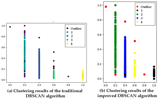 Figure 13 shows the comparison of clustering results, where Figure 13a shows the results of the traditional DBSCAN clustering algorithm, and Figure 13b shows the results of the information entropy and DBSCAN-based clustering proposed in this paper. The traditional DBSCAN algorithm does not consider the data anomalies and data prediction processing methods and simply sets the neighborhood radius (ε) and the minimum number of neighbors (minutes), whereas the DBSCAN algorithm based on information entropy and density introduces the information entropy and threshold value. Through the processing of noisy data and the calculation of data distribution entropy, the accuracy of the improved DBSCAN algorithm is 97.8%, which is 11.9% higher than the traditional DBSCAN algorithm. The algorithm proposed in this paper has more accuracy in classifying clusters of data nodes associated with fault information.