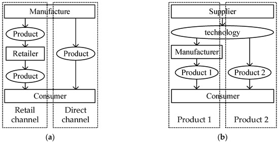 Traditional supply chain: same product, various channels. This study explores competitive products sold across different channels. (a) The traditional supply chain encroachment, and (b) the supply chain encroachment studied in this paper.