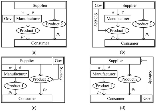 This paper builds four game-theoretic models and investigates the effect of four subsidy policies offered by the government on the supplier’s innovation activities and competitive relationships between the supplier and the manufacturer. The models are based on a scenario consisting of a supplier, a manufacturer, and the government. In this situation, the supplier implements technological innovation and produces their private brand product which encroaches upon the manufacturer’s market. The manufacturer buys this new technology from the supplier to incorporate it into their own products for sale in the market. While promoting social welfare, the government subsidizes innovative activities implemented by suppliers. Considering the diversification of government innovation subsidies and the maneuverability of model building, this paper abstracts government subsidies into three situations according to the objects of subsidies [10,11]. These models involve Bertrand competition wherein each participant decides their own product’s price [12], as well as a Stackelberg game model in which the government acts as a leader while suppliers and manufacturers act as followers under conditions of subsidies [13].