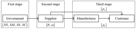 The game sequence can be depicted as Figure 3. In the first stage, the government decides on subsidy programs that maximize social welfare [49,50]. Given that technological innovation requires much more time than production, we assume that the innovation level is determined before the price of the product is set. Therefore, in the second stage, the supplier decides the level of innovation () and the price of their new technology (). In the third stage, manufacturers and suppliers decide the prices for products 1 and 2 at the same time.