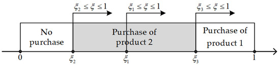 Notice that there are three key values for the consumer’s reservation price, namely, , , and . , derived from which means that there is no difference in a customer’s utility of buying product 1 or not. , derived from which means that there is no difference in a customer’s utility of buying product 2 or not. , derived from which means that there is no difference in a customer’s utility of buying product 1 or product 2. There are six permutations of , , and , but if and only if and , the sales volume of the two products is non-negative and consumer preference is complete. As a result, the market distribution is shown in Figure 4. All customers with reservation prices on the two kinds of products in the interval will buy product 1, because in the interval and . If the customers’ reservation price is in the interval they will buy product 2, because in the interval and . On the contrary, they will not buy any product if their reservation price is in the interval , because and .