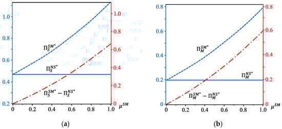 Specifically, under strategy SM, an increase in will result in customers who buy product 1 spending less money and more customers buying the manufacturer’s products (). This increasing demand will incentivize the manufacturer to raise the selling price of their end product (). Even though the supplier raises the wholesale price of the new technology, the unit profit for the manufacturer will still increase, resulting in a steady expected revenue growth for the manufacturer ().