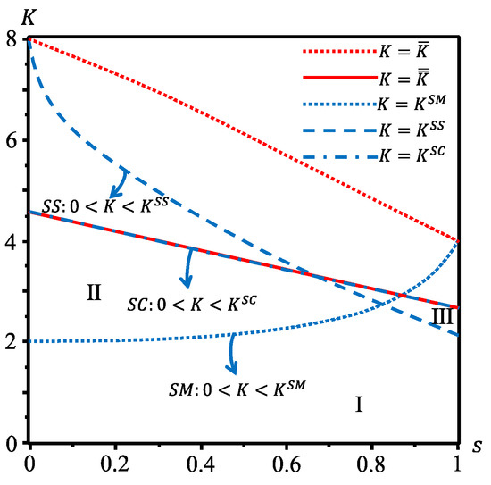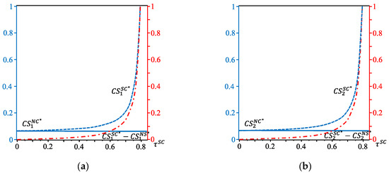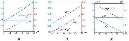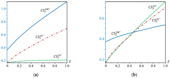 According to Table A1, it follows that which means that the government subsidy can increase the consumer surplus for product 1. Therefore, the consumer surplus of product 1 is better off without the subsidy (), while the effect of the subsidy on consumer surplus for product 2 is more complicated. Comparing the consumer surplus under strategies NS and SM, we can get if , which means that the government subsidy increases the consumer surplus for product 2, and if , which means that the government subsidy decreases the consumer surplus for product 2.