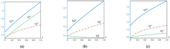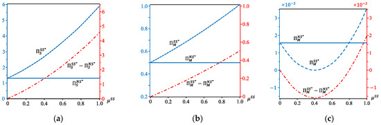 In Figure 7, when , both the supplier’s and the manufacturer’s expected revenue are impacted by the government subsidy strategy SS. Figure 7a,b depict a condition where , indicating favorable new technology consumer perception. The blue dotted lines depicting the expected revenue slope upwards to the right in both figures, showing that an increase in government subsidy leads to an increased expected revenue for supplier and manufacturer alike. Additionally, the blue dotted lines in both figures are always above their respective solid lines, illustrating that the expected revenue with a subsidy surpasses what it would be without a subsidy. Meanwhile, the red dotted lines display the difference between the expected revenue before and after subsidies, respectively; this trend further confirms that the anticipated returns under a subsidized plan surpass those of an unsubsidized plan. In Figure 7c, where implies a diminished profitability of new technologies, a U-shaped trajectory is exhibited between the manufacturer’s expectation of return on investment and the conferred government subsidy amounts via Figure 7c: when (if and ) (low government subsidies), as price subsidies for product 2 also increase, so do the expectations of a reduced income for the manufacturer; if (high subsides), increased price support for product 2 is associated with an increasing anticipation of returns for the manufacturer until reaching the threshold (equal to 0.8 if and ). Beyond this point of return, expectations under subsidization surpass those without it.