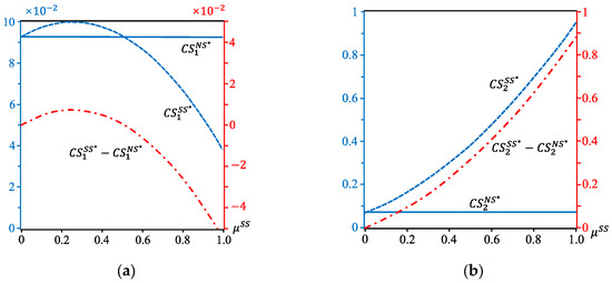 Figure 8 describes the different influences of a subsidy (SS) on the consumer surplus of products 1 and 2. To make the graph more readable, let and within the limits of constraints. In Figure 8a, the blue dotted line represents the change in the consumer surplus for product 1 with regard to the amount of the subsidy. The government’s price subsidy for product 2 has an inverted-U shaped effect on the consumer surplus for product 1: when the subsidy amount is low (, if and ), the consumer surplus increases; however, when it is high (), the consumer surplus decreases. If it reaches a certain threshold (, if and ), with further increases in the subsidy amount, the consumer surplus begins to fall below that without subsidies. In Figure 8b, the blue dotted line represents the consumer surplus for product 2 and its increase with additional subsidization; the consumer surplus for the subsidized product 2 is always above that without subsidies (which is represented by the blue solid line). The government subsidy of product 2’s price, therefore, has a steady positive effect on its consumer surplus.