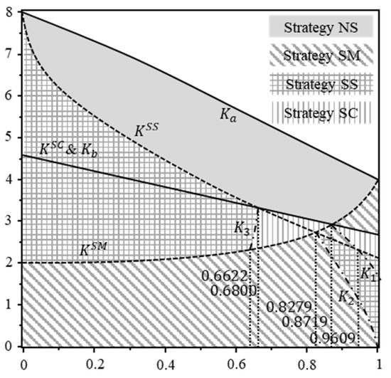 According to the government’s expected revenue under strategy SM and SC in Table A1, we have . In the area , The denominator . Let , is a function of degree one with a negative coefficient of degree one with respect to . By solving the function we have . Let , considering the graphical properties of the first-order function we can get that () if and () if .