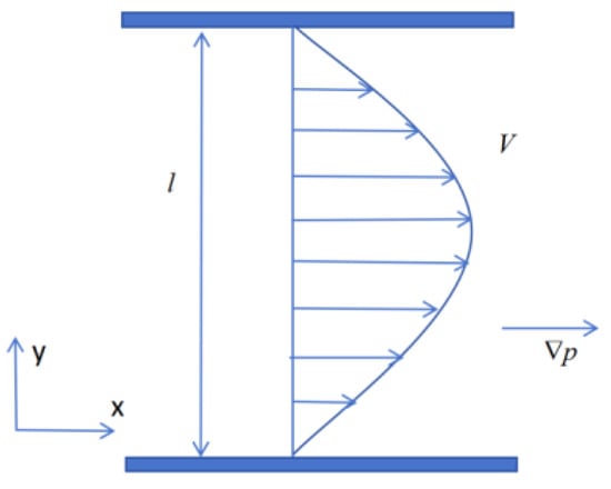 Poiseuille flow is a fluid motion problem between two infinite plates separated by a certain distance, which is a simplification of pipeline flow, and has wide applications in the fields of bioengineering, chemical engineering, and environmental engineering. The calculation model of Poiseuille flow is shown in Figure 1. This flow needs to consider the viscous effect of the solid wall boundary. Due to the fact that Poiseuille flow does not consider mass forces, the motion of the entire flow field is achieved under pressure gradient driving. As the velocity of particles gradually increases, the influence of the viscous term also gradually increases, resulting in a gradual decrease in acceleration. When the velocity increases to a certain value, the velocity of the flow field no longer changes after the viscous and pressure terms are balanced, and the entire flow field reaches an equilibrium state. At this point, the velocity of the entire flow field cross-section forms a quadratic parabolic distribution.