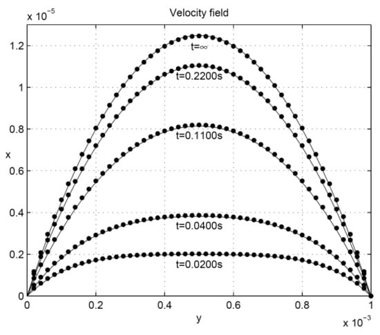 The analytical solution of Poiseuille flow can be obtained according to Morris’ literature [20], as shown in the following equation: