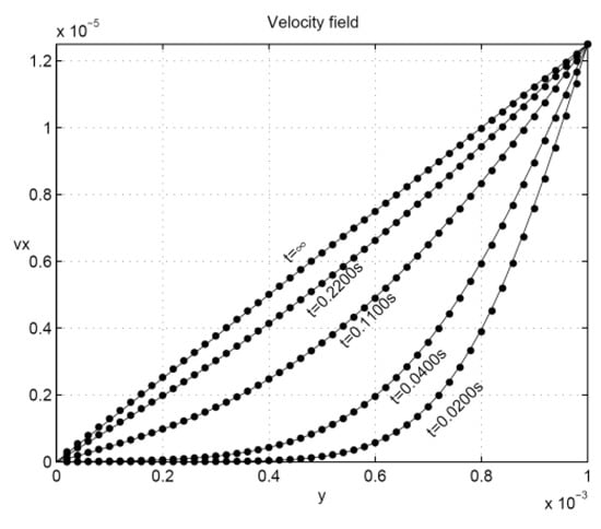 The calculation model of Couette flow is shown in Figure 4. The size of the simulation region for Couette flow is the same as that for Poiseuille flow in the previous section, with the only difference being the change of the upper boundary from a fixed wall to a moving boundary, with a velocity of v 0 = 2.5 × 10 5 m / s . Other numerical parameters remain the same as for Poiseuille flow in the previous section. After 5000 computational steps, the simulation reaches a steady state. Figure 5 shows the velocity distribution at 5000 steps. It can be observed from the figure that the particle velocity is greater closer to the upper plate. Figure 6 presents the velocity distributions obtained by the SPH method and the analytical solutions at different times and at the final steady state. It can be observed from Figure 6 that the results obtained by the SPH are quite consistent with those obtained by the analytical solution, with an error not exceeding 0.5%.