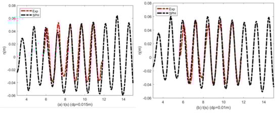 On the basis of Ren et al. [21], Domínguez et al. [22] conducted a more detailed study and explored the comparison between experimental and numerical results at different resolutions. Figure 9 shows the water elevation measured at the object location, but without the presence of the object at different numerical resolutions. It can be obviously seen that the accuracy increases with the increase of resolution, as shown in Figure 9. However, considering the time consumption, this article uses particle distance dp = 0.01 m. From the above figures, it can be seen that the model in this paper can well reproduce the wave generation and evolution process in the experiment, as well as the interaction with the floating body, verifying the reliability of this model. There is a certain error between simulated and experimental values at some points, as shown in Figure 10, which may have been no kernel correction. The average error is 0.0153 and 0.0096, respectively.