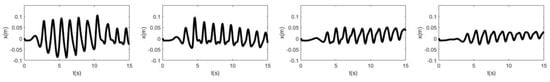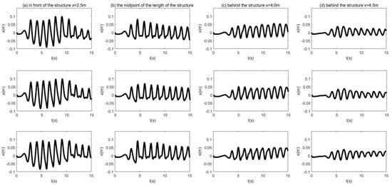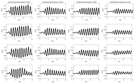 Figure 11. From top to bottom, the wave elevation of structures with a height of 0.1 m, 0.15 m, 0.2 m and 0.25 m and a length of 0.3 m are taken at the monitoring points x of 2.5 m (in front of the structure), 3.15 m (above the structure), 3.8 m and 4.5 m (behind the structure), respectively.
