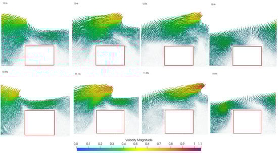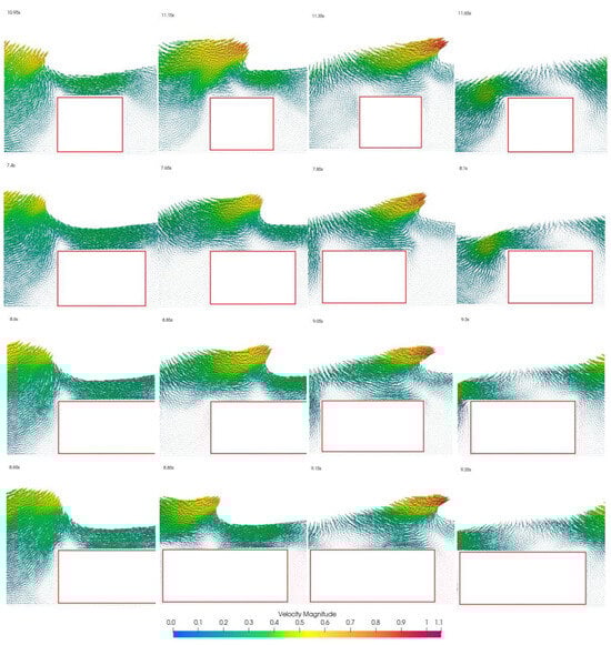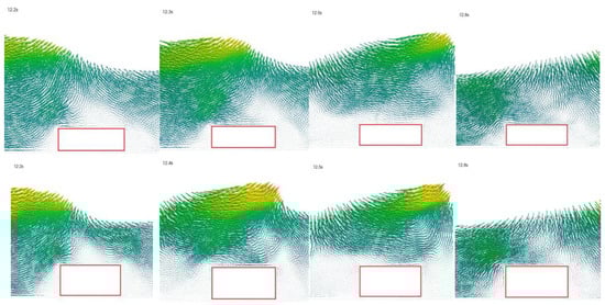 To consider the influence of structural height on numerical dissipation and wave breaking, the numerical examples used structure heights of 0.1 m, 0.15 m, 0.2 m and 0.25 m, a wave amplitude of 1.0 m, a period of 1.2 s, and the length of the structure as fixed at 0.3 m. The liquid level monitoring points x are 2.5 m (in front of the structure), 3.15 m (above the structure), 3.8 m and 4.5 m (behind the structure), respectively. The wave elevation of the four numerical examples is shown in Figure 11. The wave elevation of the first three monitoring points does not change significantly, but the wave fluctuation of the structure with a height of 0.25 m at the monitoring point x = 4.5 m is smaller than the first three examples. The average peaks of the four numerical examples are 0.0332, 0.0310, 0.0348, and 0.0252, and the average troughs are 0.0337, 0.0324, 0.0252, and 0.0191, respectively. When the height of the structure is gradually increased, a better freak wave phenomenon is generated. During the focusing process, the velocity direction of the waves is upward, while during the attenuation process, the velocity direction is dispersed towards both ends of the structure, as shown in Figure 12. In summary, the most suitable structure height should be 0.25 m.