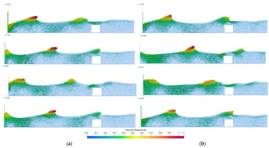 Figure 15. Velocity vector graphs of different wave conditions. (a) wave condition 1: A = 0.1 m, T = 1.0 s. (b) wave condition 2: A = 0.1 m, T = 1.2 s.
